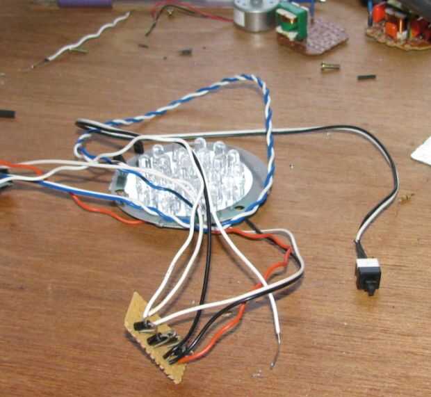 Fue corta la tarjeta de circuitos con diodos, cuidar de que se caiga el 6V a valores adecuados. En cambio, se colocan un 3 portapilas AA para proporcionar energía. Uno diodo cae el voltaje para encender algunos LEDs verdes y naranja.