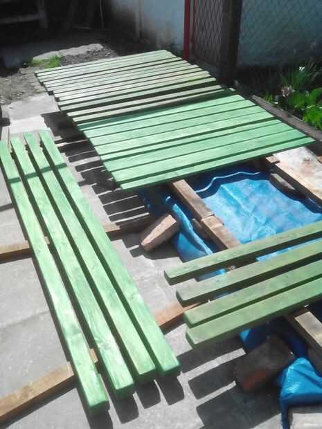 Para el aspecto y la resistencia usé dos colores de colorante (amarillo y verde). Elegí la mancha sobre laca, ya que es mucho más fácil de mantener. Cuando laca empieza a saltar, todo tiene que ser despojado y pintó otra vez. Con la mancha puede sólo periódicamente (aproximadamente una vez en dos años, dependiendo el clima) aplicar una nueva capa.