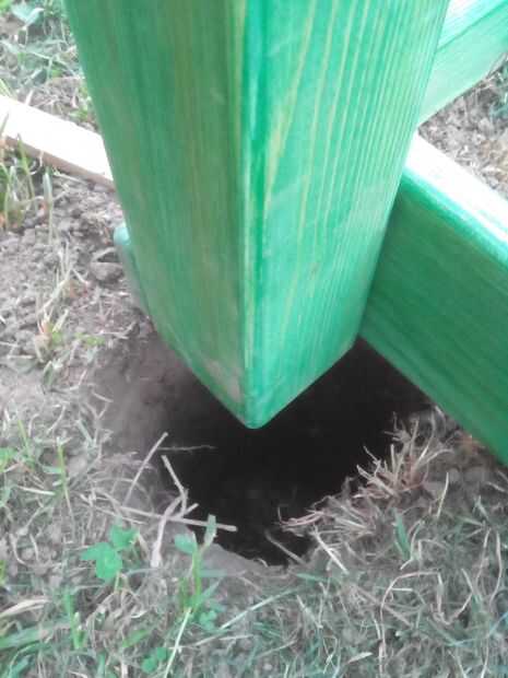 El hormigón utilizado es listo mezclado seco de concreto, que solo necesita ser mezclado con agua. El agujero en el suelo funciona como el elenco, así ningún bastidor madera fue utilizada. Después de mezclar el concreto, simplemente llene los agujeros con él. La parte superior se hace cónica, así la parte superior del hormigón tiene las mismas dimensiones que la posición de la viga. Comprimir el concreto lo más posible. La brecha entre los bordes del agujero y el concreto se quiere cubrir con tierra y comprimido, por lo que el hormigón no tiene dónde ir y obtiene empujado contra las vigas, por lo que estar realmente en él.