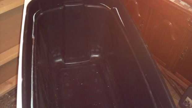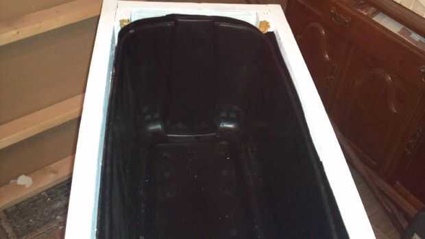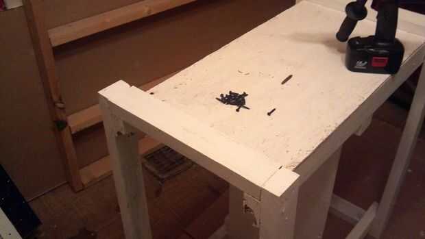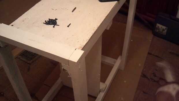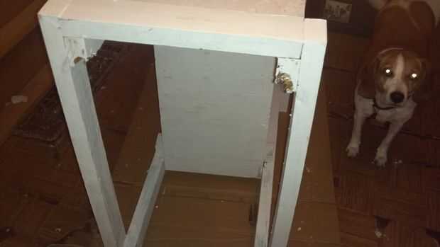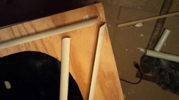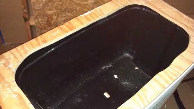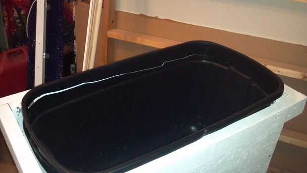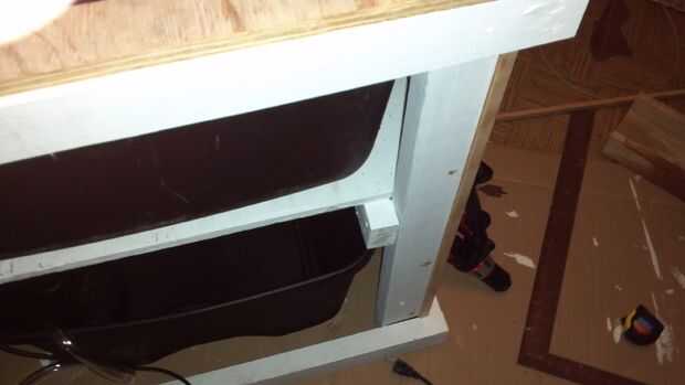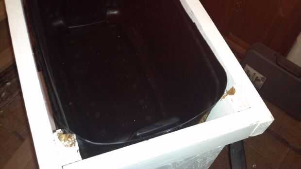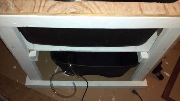 Compré madera barata y cortado a la medida que incluya el marco y la plomería y contenedores. Terminé con algunas lagunas así que compré algunos moldeado para ocultar las costuras. Luego cortar un trozo de madera contrachapada para la parte superior, puso la bolsa boca abajo sobre la madera contrachapada y remontar la bolsa. Que un agujero en la parte superior ligeramente más pequeño que la bolsa con una sierra de calar / y sierra alternativa. Terminar todo el proyecto con su método favorito. La dejé primer blanco por lo que puede pintar cualquier color que querían.