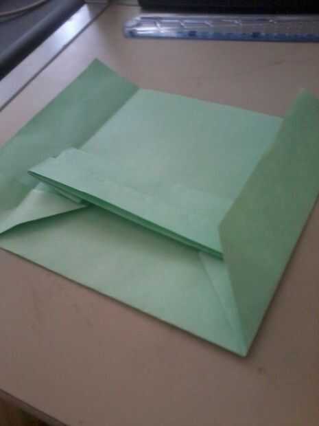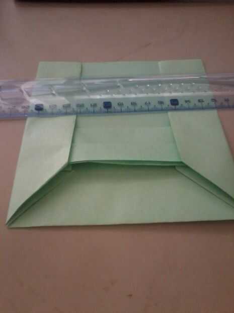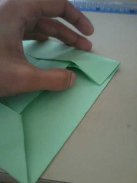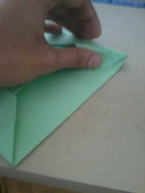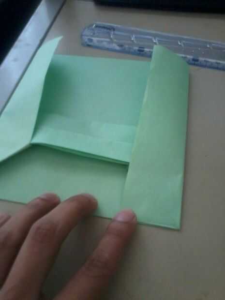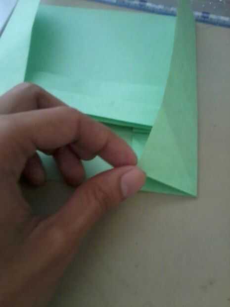 Mira las fotos de 2 º y 7 º en este paso. Sin la regla sobre el papel (Foto 2), abre como la foto 1. Para bloquear las aletas laterales en su lugar, doblar la parte inferior de las aletas laterales como se muestra en las fotos 5 y 6 y empuje dentro. Sólo tienes que seguir el pliegue de lo que los triángulos previamente.