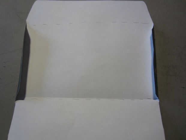 Con la aleta del sello de la envolvente apuntada hacia arriba, doble las aletas laterales hacia adentro y abajo hacia arriba como se muestra en las fotos.