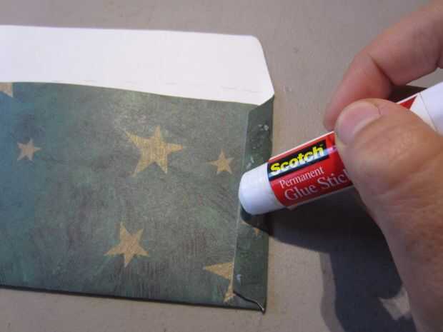 Extender el pegamento en las lengüetas dos laterales, luego doblar abajo hacia arriba, presione con los dedos en los lugares donde el pegamento es, asegúrese de que están haciendo buen contacto con el pegamento.