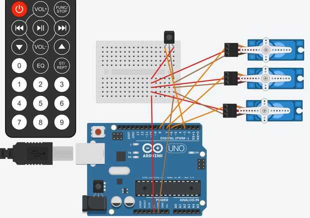 Utilice los cables que viene con el controlador para conectar el receptor a la arduino y protoboard. Siga el diagrama de arriba para configurar el controlador de IR con los servos. Asegúrese de que el controlador esté apuntando al sensor. No va a funcionar si no es así.