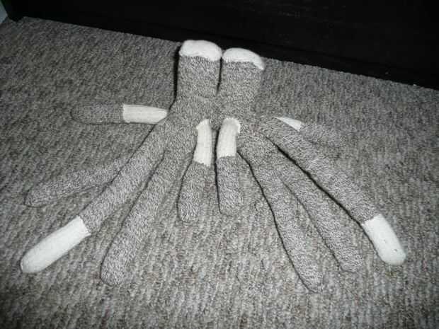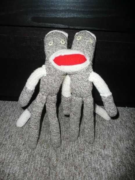 Después de ver tantos monos del calcetín genérico que parecen gemelos o hermanos, me preguntaba si había cualquier monos del calcetín de siamesa. No pude encontrar ninguna, así que tuve que hacerlos. He aquí: Los gemelos. Eran un dolor en el culo para hacer. Cada uno tienen sistemas completos de extremidades y colas, pero comparte una boca.