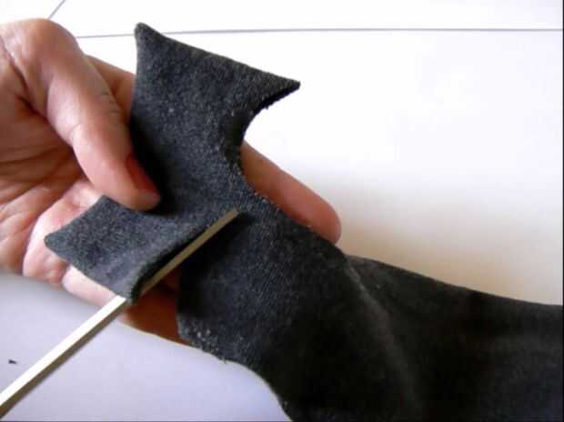 Cortar por el centro de estas tiras, separándolas y corte el área final del calcetín. Gire el calcetín del lado derecho hacia fuera desde el pequeño agujero entre las piernas.