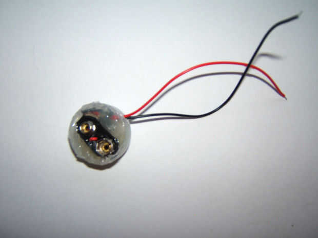 El clip de 9V en la tapa de centro. Asegúrese de no que se cruzan cables y llene la parte inferior de la tapa con pegamento caliente para que todo se pega en su lugar. Asegúrese de que usted no poner demasiado pegamento. Podrá todavía acoplar una batería de 9V cuando esto se hace.