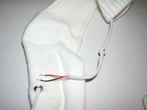 Vas a querer atar el cable de audio a un anillo de plástico en el interior del calcetín para que el cable de audio no puede ser arrancado a través del ojal. Tomar el anillo de plástico y pasar el cable por unos de 4" y luego recorrerlo nuevo. Ahora debe ser atado en el lugar. Puede Agregar una pequeña gota de pegamento caliente en el cable envuelto alrededor del anillo para la fuerza adicional.