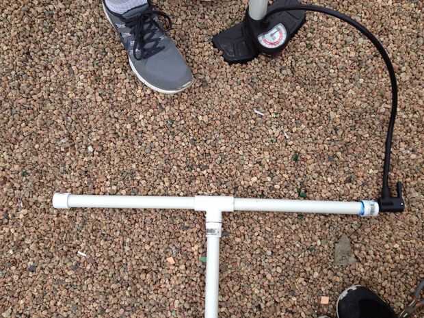 1. pegue el otro extremo de 3' pieza de PVC en el extremo del macho rosca adaptador desde el lanzador en forma de T y asegúrese de que cuando pegue el extremo de la L en forma de lanzador es hacia arriba en el aire. Si no es recto el cohete no irá hacia arriba en el aire