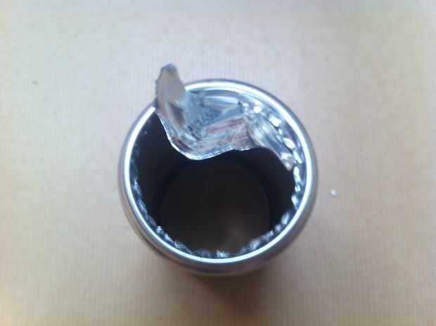 -De 11 de estos 12 latas (uno es teated otra forma), uso el abrelatas para recortar la parte superior de aluminio