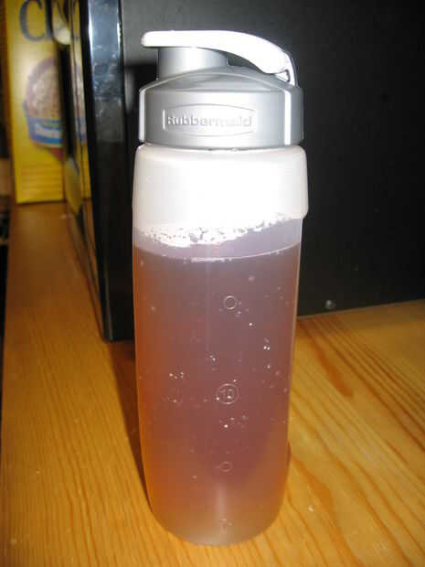 Ahora utilice un embudo para verter el jarabe en un recipiente de almacenamiento de algún tipo. Una botella de aderezo plástico funciona bien ya que tendrá que ser capaz de verter el almíbar. Asegúrese de que el envase es bastante grande. El que uso es 600 ml.