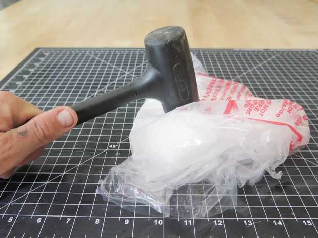 Romper el hielo seco con un martillo, o sólo golpear la bolsa contra una mesa. Desea que el volumen aproximado de una pelota de ping-pong en trozos y echar en la taza. Mejor Date prisa, tus zombies buscan sedientos.