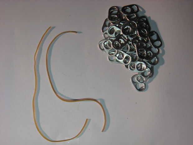 Ahora vas a tener que recoger materiales para este proyecto. En el pasado, utilicé unos 36 fichas pop, pero en esta vas a necesitar un par más. Calculo que oh tendrá unos 9 más. Por lo tanto, para estar seguro, me gustaría conseguir un total de cerca de 50. También vas a necesitar dos bandas de goma que se cortan, por lo que ahora son una cadena en lugar de un círculo. Así que añadir dos bandas de goma 10 pulgadas de largo.