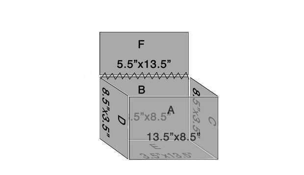 b. prender el 3,5 "x 13.5" pieza (E) a lo largo de la parte inferior de este tubo formando una "caja" - cada lado de la E se cubrió a otra pieza (los lados 13.5" a la A y B y las 3,5" partes C y D)