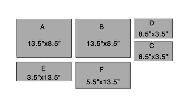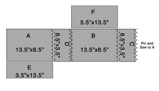 a. el 13,5 "x 8.5" piezas (A y B) forman los lados de la bolsa; el 8,5 ' x 3.5" perno de las piezas (C y D) a éstos a lo largo de los lados de 8.5" de cada uno. Esto básicamente forma un tubo de tela