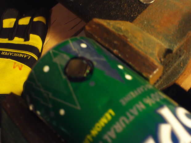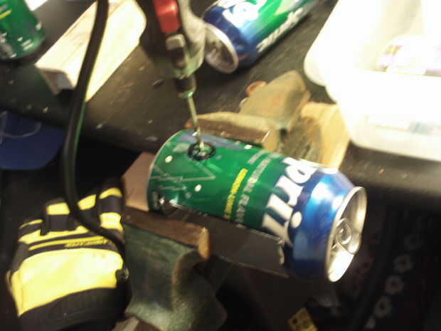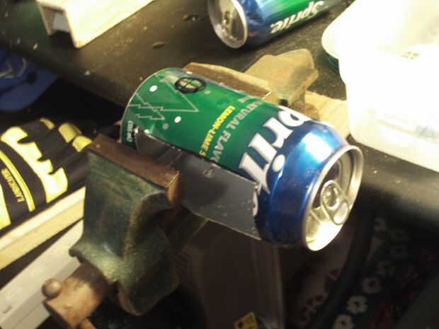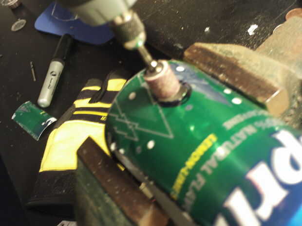 Luego la abrazadera la soda puede abajo y recortar el área de la puerta usando la herramienta dremel rotary corte discos.
