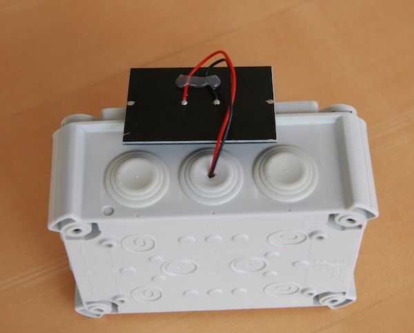 Primero perforamos un agujero a través de la alimente el alambre. A continuación Aplique pegamento en el panel y fijar en el lado de la caja, asegurándose de que también sella el agujero que alimenta el alambre a través de.