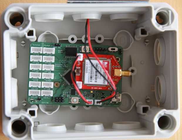 La caja OBO tiene bastantes puntos de montaje. Utilizamos los dos orificios de montaje de la Junta SODAQ para atornillar cuidadosamente en la caja. Como veis en la foto hemos utilizado dos tornillos pequeños. Estas son realmente demasiado pequeñas para los agujeros estándar que tiene el cuadro de OBO. Para solucionar esto llenamos los agujeros con algun pegamento caliente y después de que ha endurecido el pegamento nos Atornille el tablero.