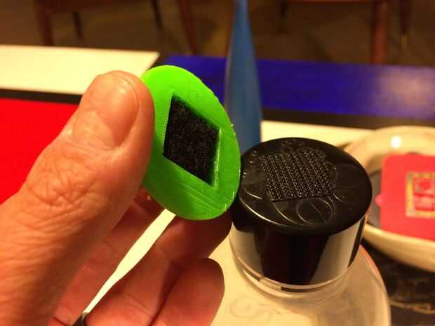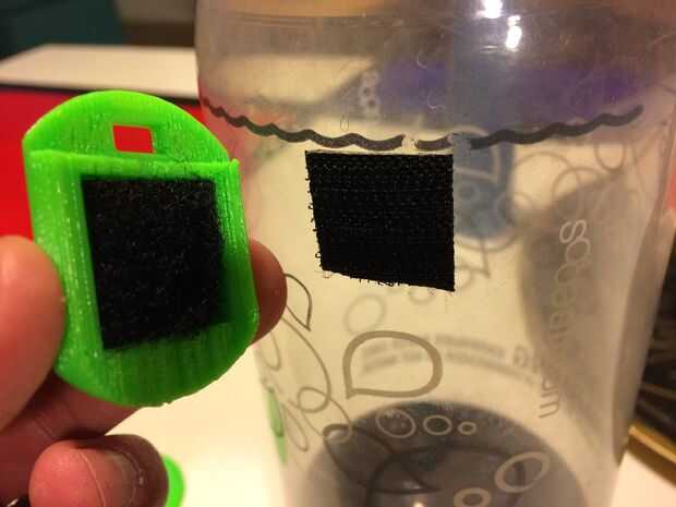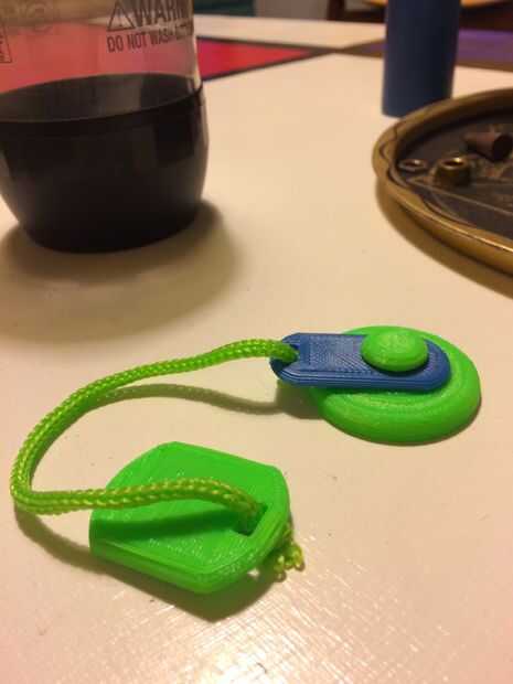 Coloque la cubierta de la tapa en la parte superior el velcro en la tapa. No deberá moverse alrededor mucho. A continuación coloque el conector de cadena de Cap en la cubierta de la tapa por lugar el orificio más grande de la tapa cadena conector sobre la espiga del casquillo de la cubierta. Luego coloque la tapa superior en la tapa cubre la espiga. Esto debe mantener el conector de cadena de casquillo en su lugar, pero déjelo girar cuando están girando la tapa real de la botella.
