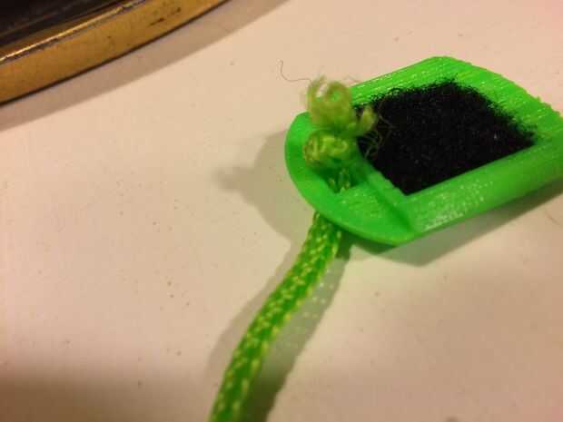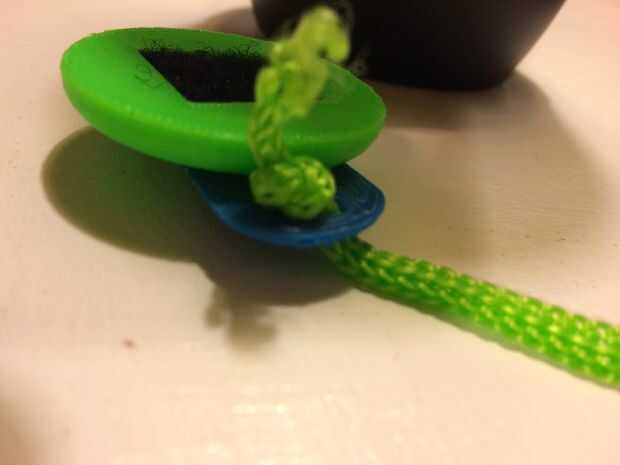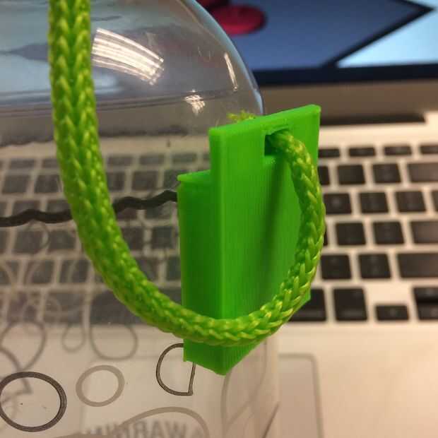 Puede ahora el trozo de cuerda a través del conector de tapa cadena del hilo de rosca y un nudo pequeño en el extremo para que la cadena no pueda deslizarse a través del orificio. Tomar el otro extremo de la cuerda y deslizarse a través del orificio del conector de cadena de botella y un pequeño nudo en el otro lado. Ahora puede conectar el conector de cadena botella al velcro unida a la botella.