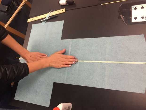 La última parte de la cometa será la parte inferior de la cometa en el triángulo. El mástil se aplicará horizontal del triángulo como se muestra en la imagen. Una vez más, permite y pulgadas a cada lado y sujete los largueros en su lugar durante 60-90 segundos y deje que se seque.
