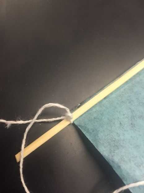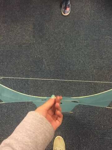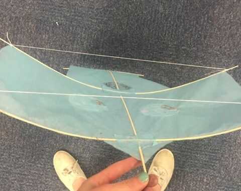 Este paso es algo complicado, así que escucha atentamente. Para hacer la parte del flex de la cometa que se necesita en orden para él volar, comience cortando un trozo de cadena que es más de uno de sus mástiles de veintidós pulgadas alrededor de tres pulgadas. Esta será la cadena que sostiene su flex en su lugar. Atar un extremo de la cuerda a uno de los lados de su palo horizontal donde hay un pequeño mástil extra, asegúrese de doble nudo lo para que no deshaga. Ahora atar el otro lado para el otro extremo de los largueros. Si la cadena no crea una curva en su cometa Envuelva la cuerda alrededor del larguero hasta que haya una curva leve en su cometa, como se muestra arriba. Hacer esto a todos tus largueros horizontales, asegurándose de que el mástil más corto tiene menos flexible que los dos más largos.