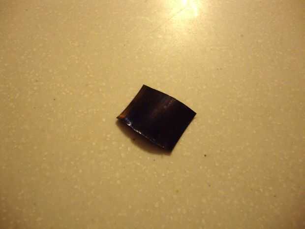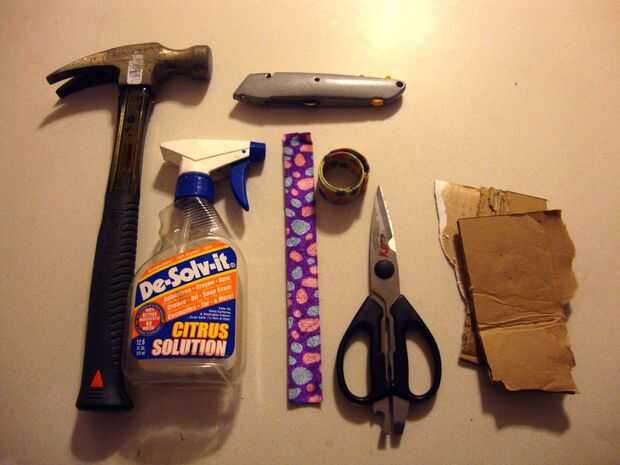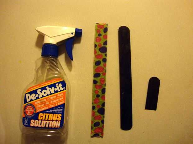 Una vez retirada la capa que queda un residuo del pegamento. Uso de-solv-it para eliminar los residuos. Lave el de-solv-it y el pegamento. Esto debe dejo una pulsera slap metal reluciente.