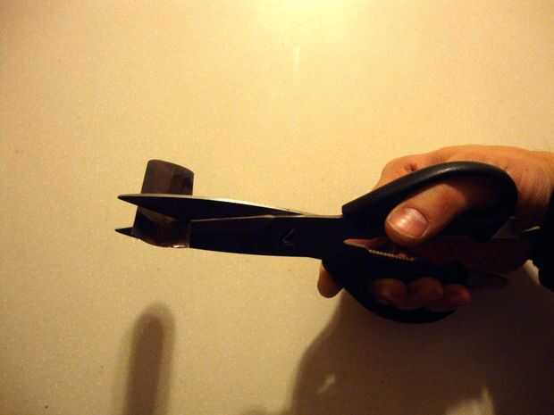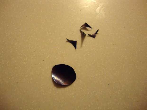 Ahora, toma tus tijeras y corta un cuadrado de metal. Tomar la plaza que cortadas y alrededor de las esquinas con las tijeras. Finalmente Busque cualquier puntos afilados en el metal y los cortados. Redondeo de las esquinas y los puntos de corte para que su disco de metal no pinchar la bolsa.