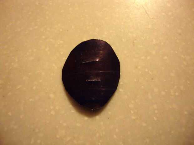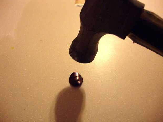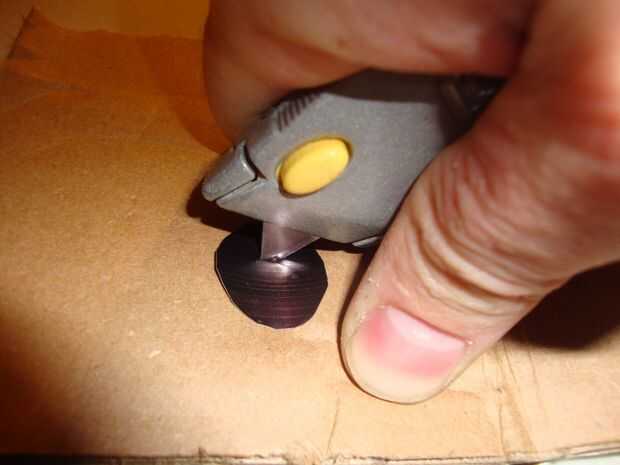 Tome el disco circular de metal y coloque en unos pedazos de cartón. El cartón ofrece un fondo suave y permite la afeitadora perforar a través del metal. Ser extra precavido (para no cortarse) toma su navaja y con mucha presión, golpear dos cortes paralelos en el disco. La dirección de estas ranuras no debe importar. Intenta hacer estas ranuras moler toquen cuando se hace clic en el disco. Ahora se dobla el metal alrededor de las aberturas hacia el exterior y las necesidades de doblaron en el. Coloque el disco en un objeto duro y golpear con el martillo.