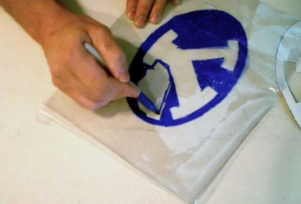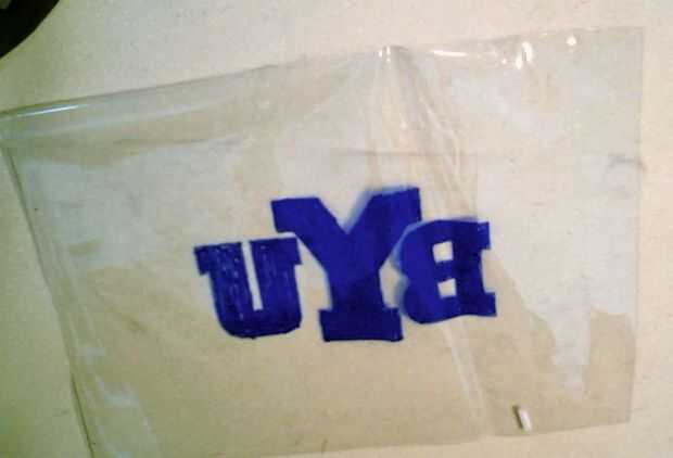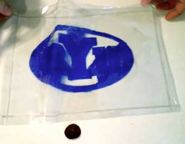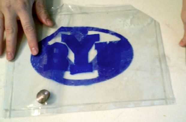 A continuación poner su insignia de deportes favoritos o diseño en el interior de la bolsa (para mí eso es BYU). Si el color en el exterior de la bolsa esos colores lixivian y mancha su contador cuando la bolsa esté caliente (aunque son para colorear con marcadores permanentes). Trace, trace, o garabatos con marcadores permanentes un diseño en el interior de la bolsa. Olvidar que ya se dibuja en el interior necesitará inversa sus cartas. (Sería una buena idea para poner a prueba para asegurarse de que el marcador es permanente. Dibujar con su rotulador permanente sobre un trozo de vinilo y luego ejecutarlo bajo el agua para asegurarse de que no salen. Tuve un marcador que dice que es permanente que lavarse cuando pongo el acetato de sodio dentro).