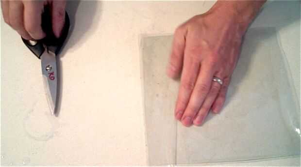 Por último, cortar una esquina de la bolsa lo suficientemente grande como para adaptarse a su disco de metal, luego inserte el disco. Lo hago de esta manera es que cuando agrego el acetato de sodio caliente a la bolsa, hay menos área para sellar.