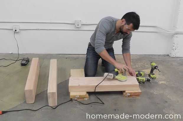 Lije todas las piezas de 4 x 8 con una lijadora orbital. Redondeado los bordes usando almohadillas de lijar de grano 80 antes de lijar todo liso con pastillas de grano 220.