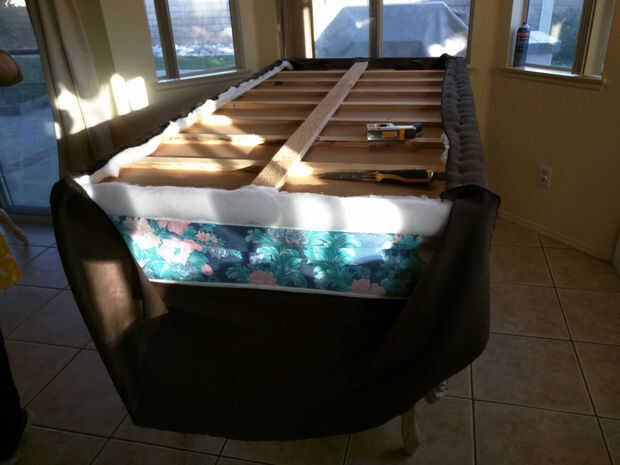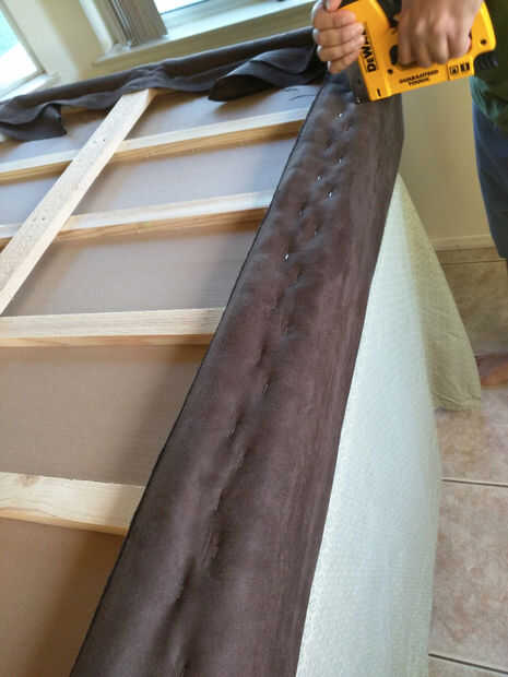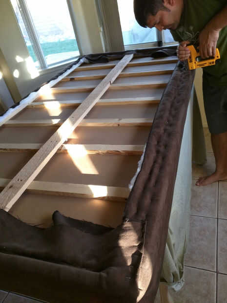 Coloco la cama recién liberada en forma de sandwich con la tela de tapicería, el bateo, entonces la base de la cama y por último el colchón. Empecé por la perforación de un lado de la tela de tapicería. Una vez hecho esto me tiró duro en el otro lado y comenzó a sujetar con grapa. Para asegurar que la tela era incluso sin pliegues inicialmente pongo grapas en los extremos y luego uno en el centro.