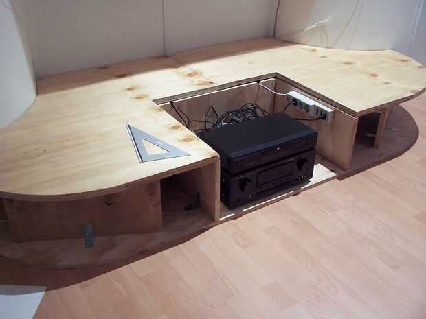 De las piezas superiores de madera, corte un cuadrado para permitir un fácil acceso al cine en casa. El agujero se cubrirá por el pedazo cortado de la madera.