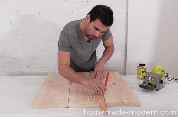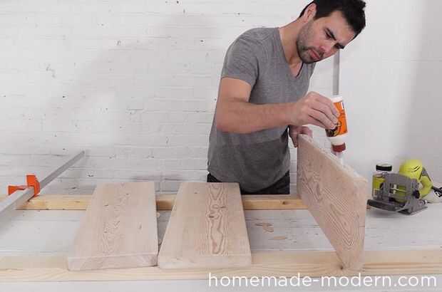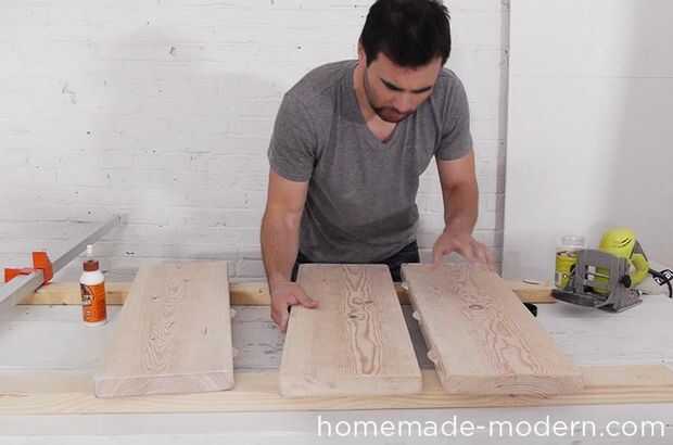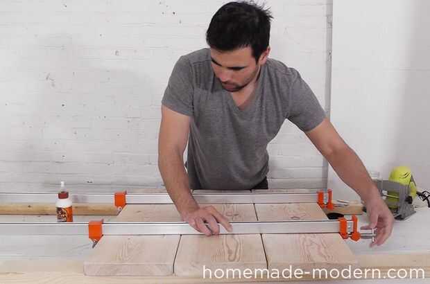 Pone el 2 × 10s para 3 paneles en el piso. Utilizar el unidor de galletas para cortar muescas en el 2x10s. Colocar pegamento en las muescas y colocar un bizcocho cubierto de pegamento en las ranuras. Utilice las abrazaderas para sujetar los tableros juntos mientras el pegamento seca.