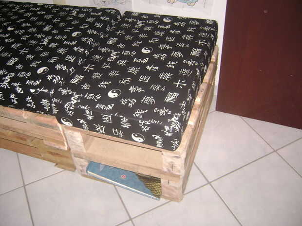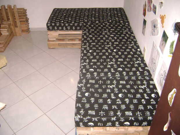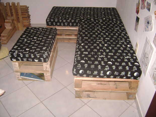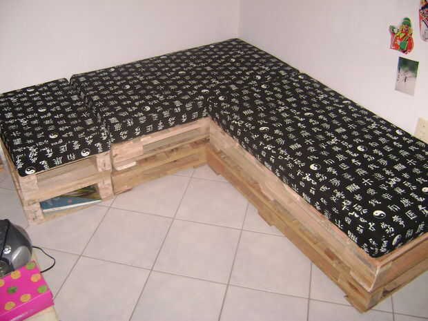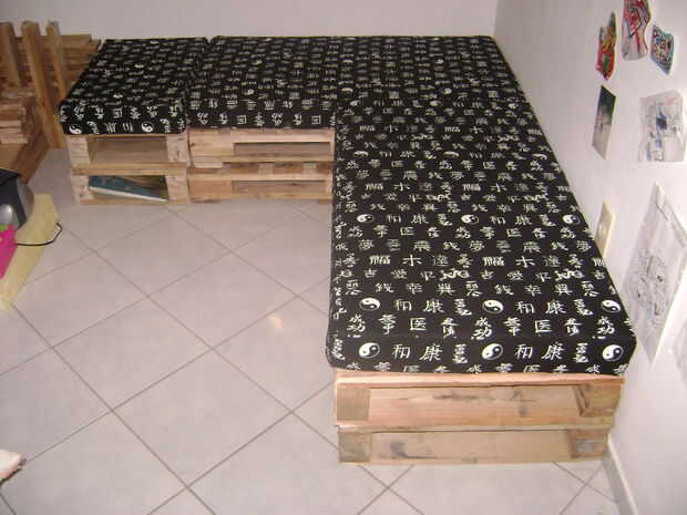 Paso 8: Sofá de palets finalizado - Disposicao puff (plataforma sofá hecho - arreglos de reposapiés)