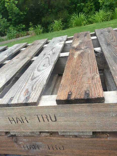 Lo primero que hice fue recopilar un montón de plataformas. Terminé usando 9 paletas de tamaño medio. Opté por conseguir la mejor calidad que he podido encontrar porque quería que esto dure tanto como sea posible. Encontrar algunos que tienen una madera marca fresco quemadas o estampado en el frente. Es un pequeño detalle extra.