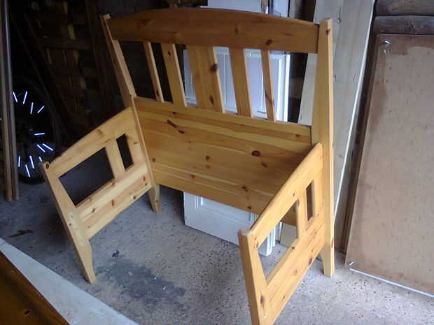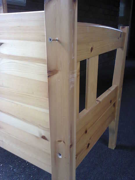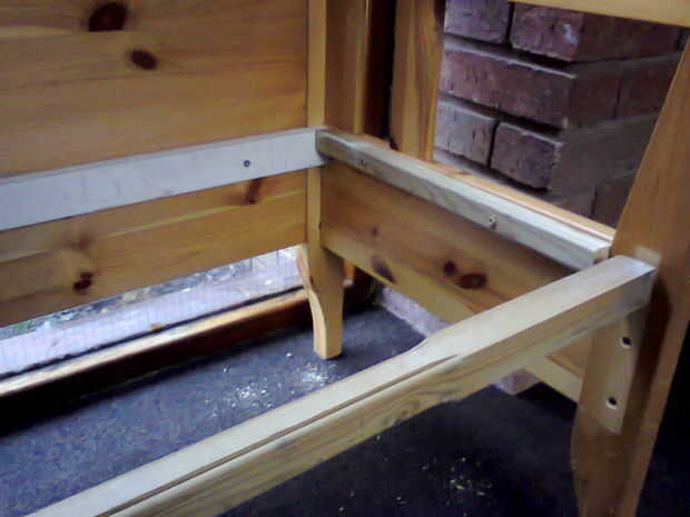 Como se puede ver, había aserrado el tablero de pie en la mitad ya que estas piezas se utilizaron para los lados de la misma. Debe encontrar agujeros en él desde el diseño original que se puede utilizar para fijar las piezas juntos. En la segunda foto, utilicé tornillos largos (unos 8cm) para asegurarse de que tiene bien y hay dos en cada lado.