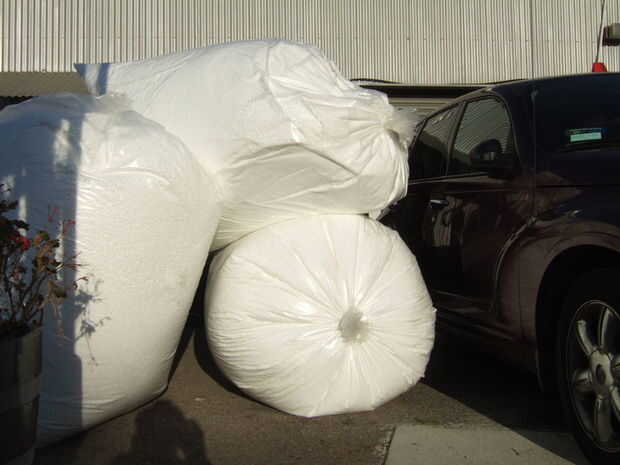 donde conseguir los frijoles! usted tendrá un montón de granos, así que lo mejor es encontrar un fabricante local de productos de espuma de poliestireno (EPS). probar la epsmolders.org de sitio web para obtener una lista de fabricantes EPS en el país. obtener los granos será una divertida excursión a sí mismo, como se puede ver a continuación. el término técnico para lo que quieres es "perlas de poliestireno expandido" o "Granos del EPS" para el cortocircuito. generalmente tendrán nuevos granos "(granos virginales del) y habas usadas ("triturado"). Virgen cuesta alrededor de 10 x tanto como triturado, generalmente más de lo que desea gastar en un proyecto loco que leer sobre en Instructables. mi mfr local espuma (espuma de Bahía en Hayward CA) vende bolsas de 35 pies cúbicos de triturado por $10 cada uno. tenían una gran montaña de ellos detrás de su fábrica! el lujo lugares en línea que venden bolsas de frijoles le dirá que granos virginales tienen una mejor sensación en el puf, pero mi sofá parece perfectamente bien con el triturado. Recuerde: molido = reciclaje!