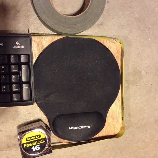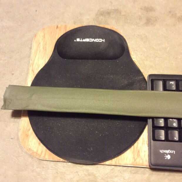 Me gusta usar un material de rigidez aquí porque la cinta del conducto es demasiado floja en su propia y necesita ayuda, pero si la cinta tiene cierta rigidez del propio (como, tal vez cinta gorila) que podría escapar sin el material de refuerzo adicional. Lo principal es el encargado de ser flexible, pero no caer y llegar en el camino de la mano y el ratón durante el uso.