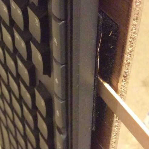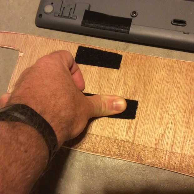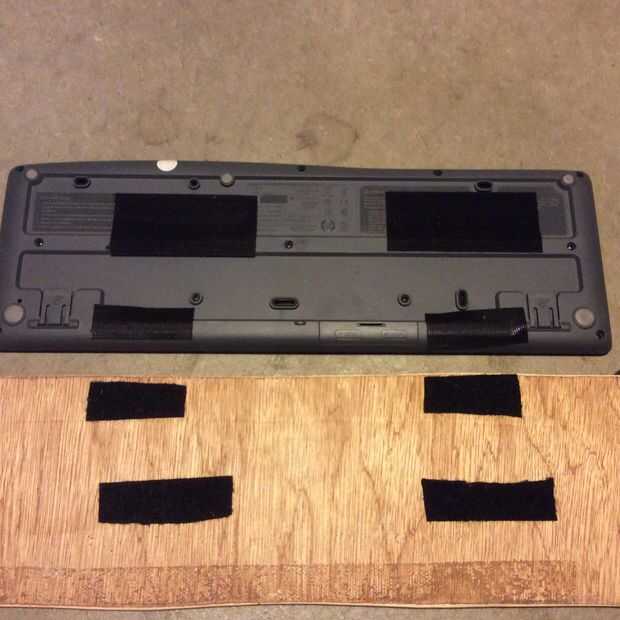 Todavía necesitamos ejercer presión sobre el Velcro en posición sobre el tablero para fortalecer el vínculo con la madera. En este punto, los ganchos y los lazos son más fuertes que el vínculo entre la madera y el adhesivo de Velcro y quitar el teclado es probable que tire el acoplamiento Velcro de la madera (esto siempre puede ser el caso!).