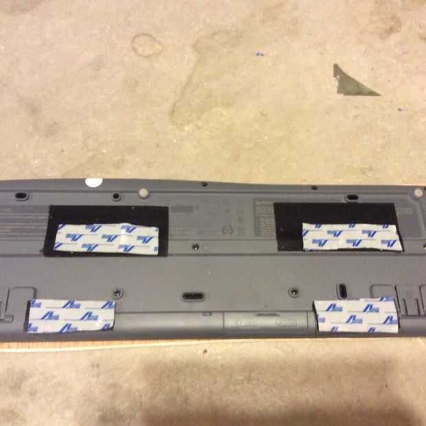 Ahora que las piezas de Velcro se unen firmemente a su posición en la parte inferior del teclado, unir todas las piezas de Velcro acoplamiento para que los ganchos y los lazos juntos, y el plástico protector es hacia arriba (w/teclado boca abajo).