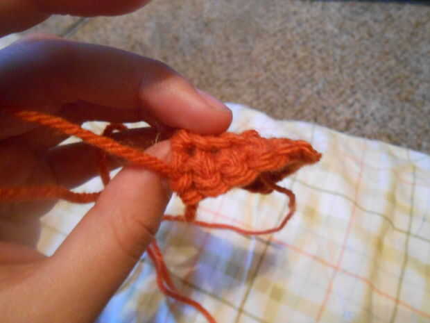 - Únete en cuatro puntadas de hilo desde el lado de la cama, sc 3 en los lazos delanteros solamente (los lazos hacia el sofá), paralelo al otro brazo.