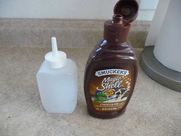 Hablando de la salsa de Chocolate Magic Shell: el pico es bastante grande, así que no te da mucho control. Me dieron bien (como se indica en la botella) y había transferido a una botella de apretón diferentes con un pico más pequeño, como en la fotografía superior.