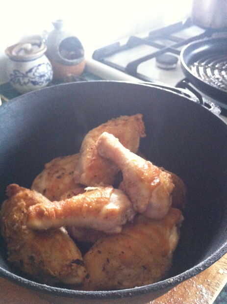 Cuando el pollo haya terminado y en la cazuela o la olla, vierte la mezcla común de cebolla sobre el pollo.