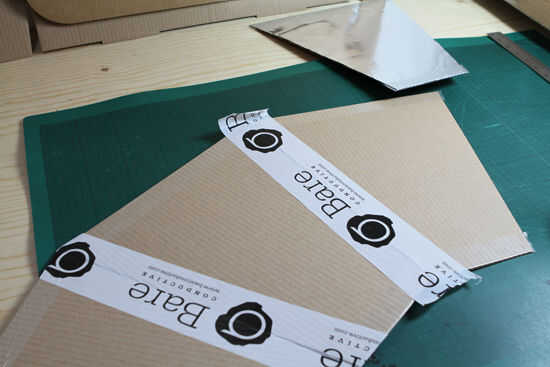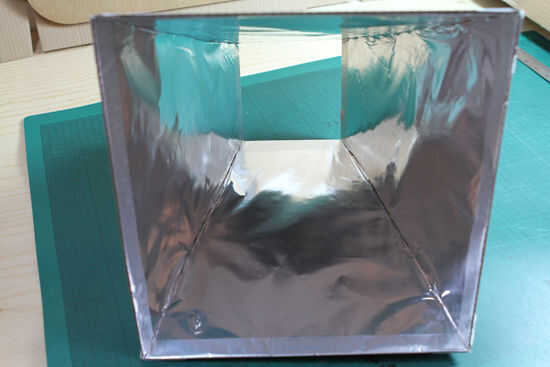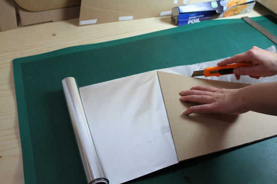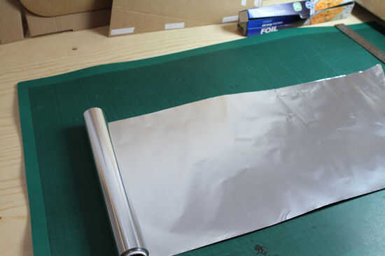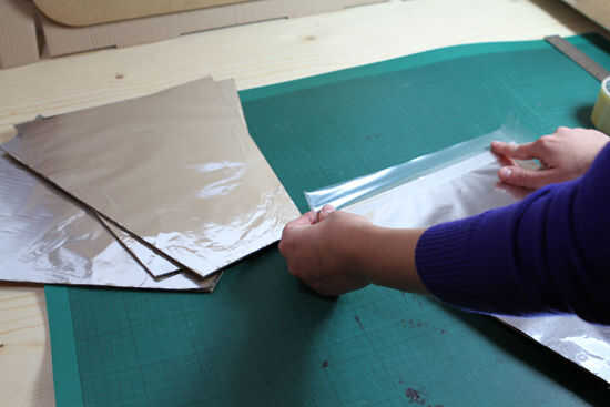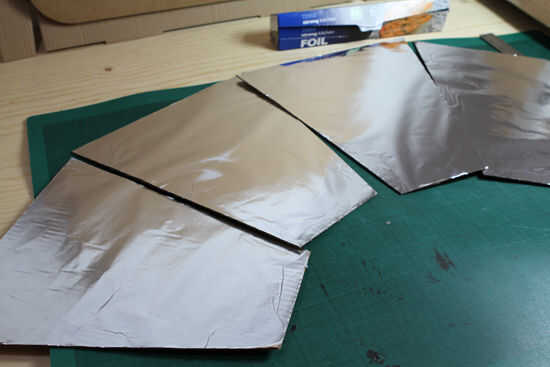 Únalos con cinta adhesiva cada lado hasta que ha reunido en una plaza, asegurándose de que el papel de aluminio está en el interior.