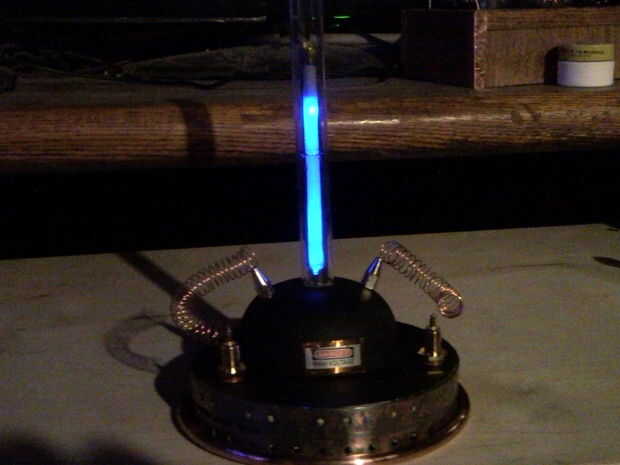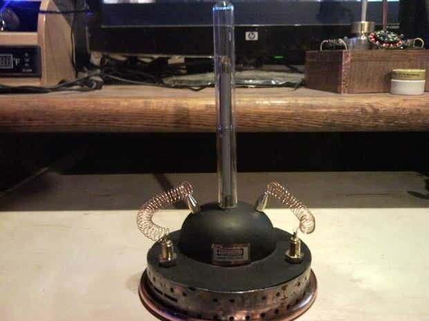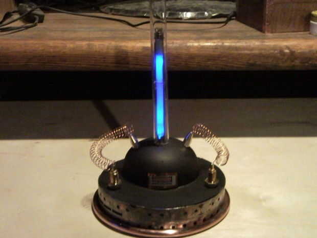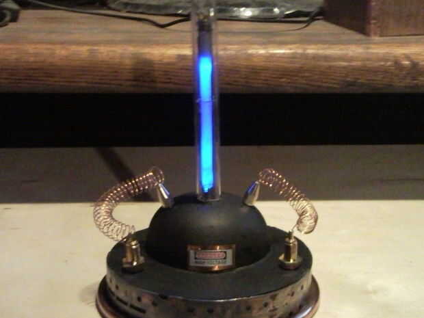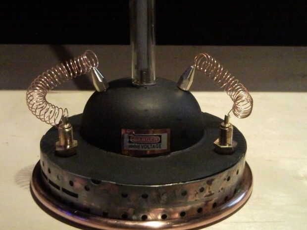 y mi favorito personal la etiqueta de tensión alta me tira de un transformador de una TV. Escurr una pila de botón (3v) robaron la bandeja de celda de botón fuera una vieja Motherboard, Tarjeta madre. El alambre de cobre que envuelve una clavija de madera para obtener la forma de resorte. El interior tubo (bajo vidrio) es un cuerpo de pluma clara.