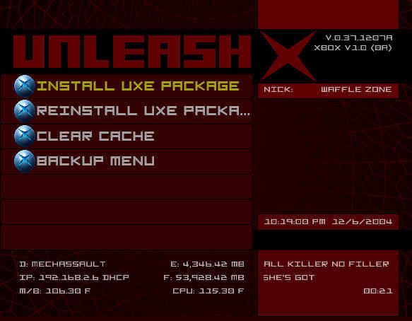 Tiempo para cargar el save juego: Inicio se carga el juego 'Mechassault', una vez en el juego y seleccionar la opción de cargar una partida guardada. Asegúrese de que se carga desde el disco duro y si es necesario eliminar cualquier existente guardar juegos que usted puede haber tenido antes copia el juego excepto hazaña sobre. El guardar juego comenzara a cargar, después de una espera de 10 segundos debe cargar el UnleashX dash. Si esto no funciona intente comenzar de nuevo, existe una posibilidad de su juego es más reciente y parches para arreglar el agujero de explotar. Debería ver el UnleashX dash que parece que la foto de abajo. En el menú principal que debería ver 'Waffle zona herramienta' presionar 'A' para entrar en este menú y ahora debería ver las opciones como la foto de arriba. En este menú Seleccione 'Instalar paquete de Deluxe' y presiona 'A' el script comenzará a copiar los archivos necesarios. Después es hacer copiar el paquete de arranque para Linux y hacer un backup de la EEPROM. En un Xbox 1.6, la pantalla mostrará probablemente una imagen corrupta, esto está bien solo ignorarla por ahora y busque su LED a destellar verde que significa el proceso de. Si su seguro no sólo expulsa el disco del juego y el poder de la Xbox después de dos minutos, esto debería ser tiempo más que suficiente para crear el backup de la EEPROM. Energía detrás y sin ningún juego en la unidad de DVD Xbox deben arrancar a la pantalla de UnleashX que vimos anteriormente. Lo primero que debes hacer es FTP en tu xbox utilizando la dirección IP que aparece en tu panel de control (usuario = xbox pass = xbox). Ahora copiar el respaldo de la EEPROM al disco duro del ordenador, el respaldo se ha hecho de su Dash MS originales, así como el paquete Deluxe instalado en E:\Backup\. La EEPROM se guardarán en E:\Backup_linux\, copiar estas carpetas y grabarlos en un CD para mantenerlos a salvo. Si usted no ve los archivos en la raíz de unidad E:\ como nuevos instaladores ponen el archivo allí, recuerde que estas son las claves para tu Xbox, suelto ellos y usted no será capaz de recuperarse de un fracaso de disco duro u otro problema. Verificar que tu Xbox juega un juego Original y luego probar una versión de back-up, si te funcionan estas pruebas con éxito han aplicado el paquete Deluxe.