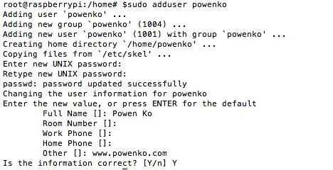 Por motivos de seguridad debe exigir cada usuario que necesite acceder a su sistema de frambuesa Pi samba para utilizar un ID de usuario. Así que nuestra próxima acción será crear un ID de usuario de samba ejecutando el siguiente comando. Usted necesitará cambiar sus preferencias de nombre de usuario powenko. Como se puede ver en Figura 5-15, se le pedirá una contraseña y otra información. La mayoría de esto es opcional excepto la contraseña.