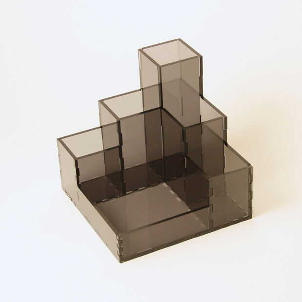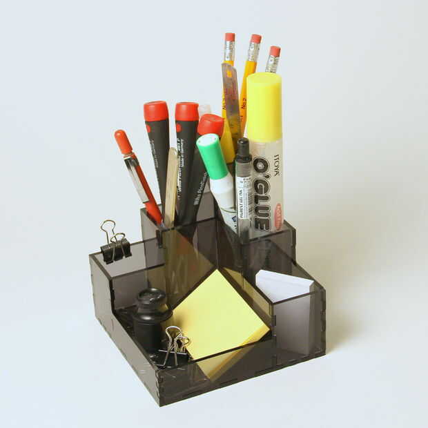 Con una mezcla de frustración en mi espacio de trabajo disminución de la diseminación de herramientas y la envidia por el éxito de sus colegas con algunas de las herramientas de Make 123D, decidí lanzar juntos una olla rápida lápiz en mi recomendado: software CAD, Alibre Designy luego la rebanada y dados con una versión previa de Autodesk 123D Make para que quede listo en el espacio juntos después de corte por láser.